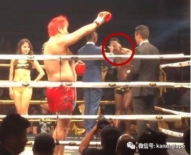 在对手,一头红发的新加坡艺人林宜傧举手欢呼胜利的时候,之前因为感觉不适,靠在擂台护绳上休息了好久的帕迪(红圈内)已经站不直身子,需要包括裁判在内的多人搀扶,后来更失去了意识。