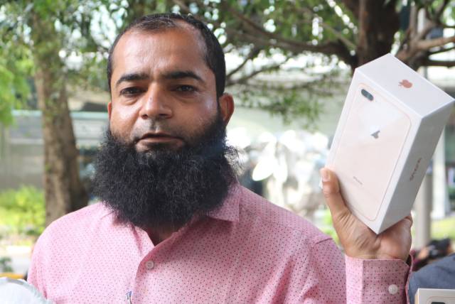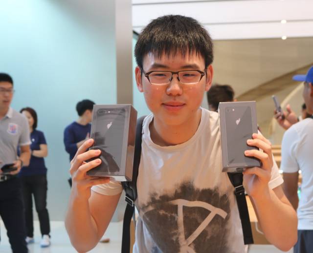 非预订区第一位拿到手机的是一个印度人,他从昨天晚上7点多就开始在店外等候,是想买两台iPhone 8 Plus 送给两个女儿当礼物。