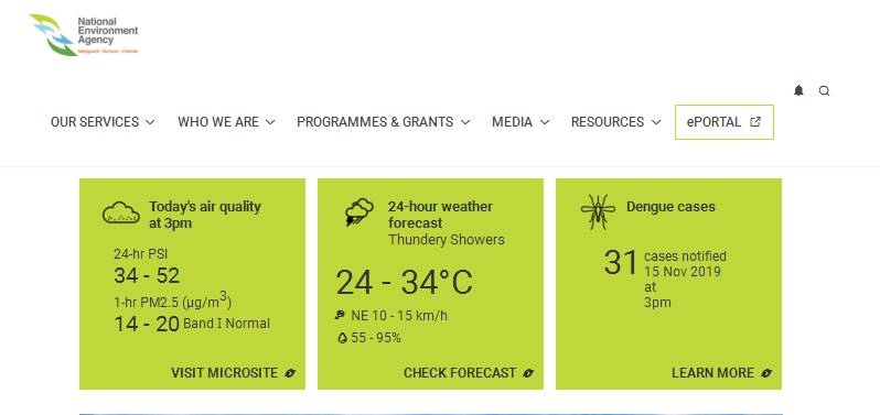 为了预防疾病,新加坡环境局(NEA)高度重视,官网首页展示有三个大项指数,其中有空气质量,天气预报,第三个就是登革热病例通报。