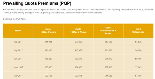 其中就要缴纳一个PQP(Prevailing Quota Premium ),这个钱是由最近三个月内的COE价格计算出来的。有两个延期供选择,5年或者10年。如果延长10年的话,付全部;延长5年的话,就付一半。