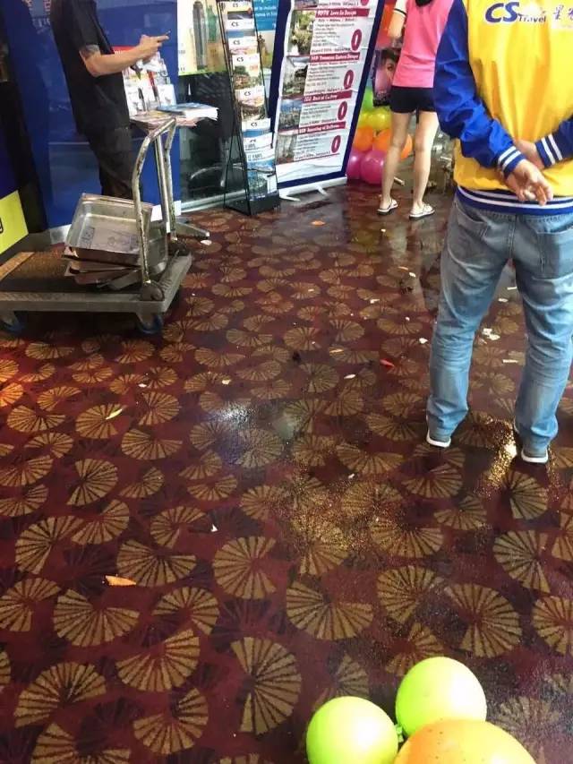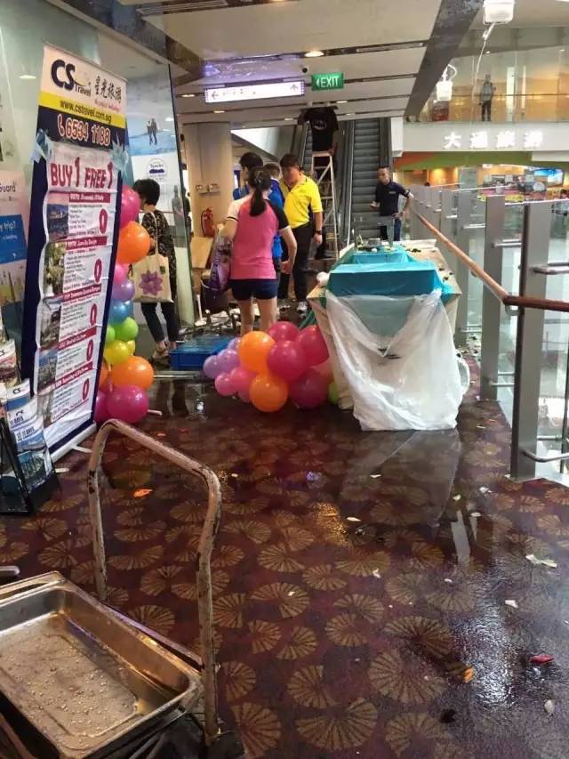 今天中午,牛车水唐城坊内的一个消防水龙头突然开启,人工雨滂沱之下现场一片狼藉。位于三楼的天宇旅行社第一时间给我们爆料: