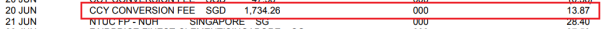 竟然为了这笔消费我又被银行暗戳戳的收取了13.87新币的汇率转换的费用,这下子等于多付了40.13新币,也就是2.35%的费用。现在的我肠子都悔青了~~