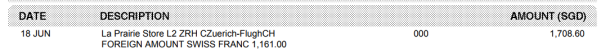 前不久我去了趟瑞士,去之前身负了同学交待的重任,那就是去买一套La Prairie 莱珀妮护肤品,毕竟作为原产国,当地的价格比较便宜。于是我就屁颠颠的跑去,按照她的交代,拍下了一套价值1161瑞士法郎的护肤品,当时习惯性的选择了以新币结算,回来后看了一下账单,被收取了1708新币,也就是说汇率是1瑞士法郎兑1.4711新币。