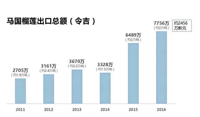 可备不住统计数据会说话~新加坡农粮局记录的马来西亚榴莲入口量,2012年是22,700吨,2016年就只有大约16,600吨了。从马来西亚进口到新加坡的新鲜榴莲,比5年前足足少了1/4。