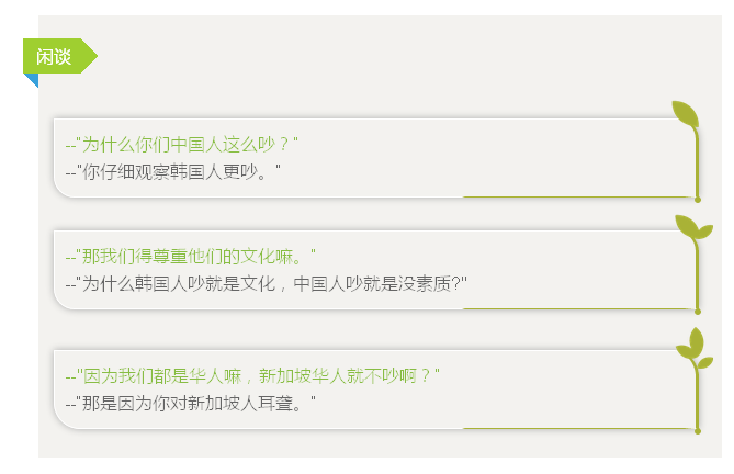 编者按以下网友投稿的部分内容,可能会惹怒一些人。新加坡眼来函照登,旨在探讨当我们身处异乡时,该怎样恰如其分和当地人(尤其当他们不太了解你来自的国家)交流,毕竟每个个体都是国家的非正式代言人,是否更应该言之有物而非夸大其词?