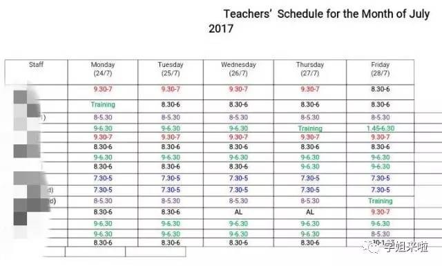 平时的上班是周一到周五,9个小时在校时间,周六半天轮值(一个月一次)。通常学校的营业时间是早上7点到晚上7点,老师们采用轮班制,保证学校全天候正常运转。