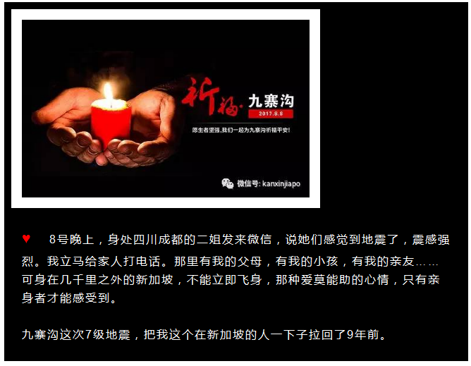 我的大四川,你脆弱过、坚强过、强大过,可这些不是为了再受一次伤害。身在新加坡的儿女,为你心疼。
