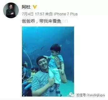 点开阿杜的个人微博,其最近更新晒出了一张与儿子于7月4日同游水族馆的照片,并以儿子的口吻解释道:“爸爸乖,带我来看鱼。”