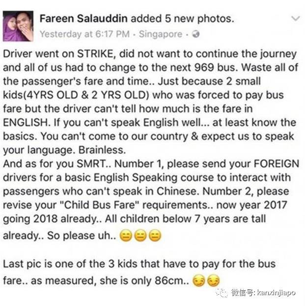 这两天,“中国巴士司机”也不是第一天躺枪:昨天还有一名新加坡家长,带着孩子上车。司机由于觉得孩子超过免费身高,要求家长付车资,却被家长以听不懂中文,要求司机说英语拒绝!之后发生的争执升级,司机更是拒绝继续驾驶。
