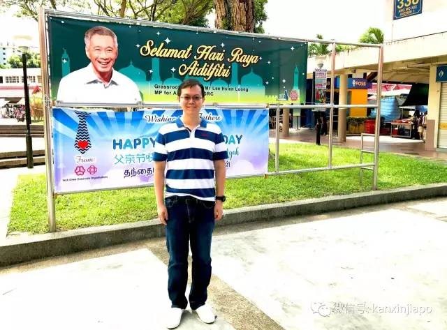 ▲站在社区布告牌前,他又和李显龙合影了一次。