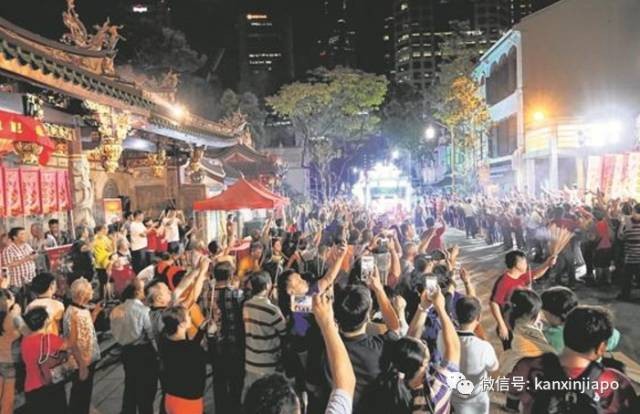 ▲昨晚,新加坡天福宫外,约万人迎驾妈祖巡游