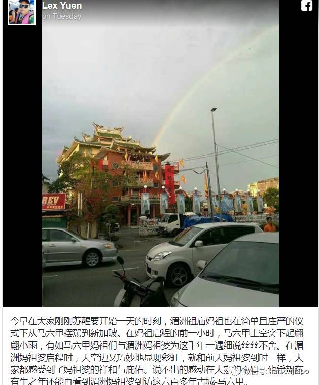 神奇的是,7月3日一大早,在妈祖抵达马六甲前,天空中就出现了双彩虹的奇景!而且,在妈祖抵达和离开马六甲时,天空都出现彩虹,当地因此流传着“妈祖来时赐福,去时为民消灾”的传说。