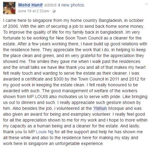 这位受到议员礼遇的外来劳工,是2006年就背井离乡,来新加坡当清洁工的孟加拉人哈尼(Mohd Hanif)。