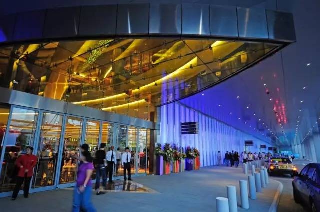 4. 圣淘沙赌场门口上方有一块掏空的部分,在新加坡这个常年下雨的地方,通过透明玻璃一抬头就可以看到上方的流水。据说,这种布局在风水里叫“淋头水”,就是用水浇灭准备进场的顾客身上的“旺火”。
