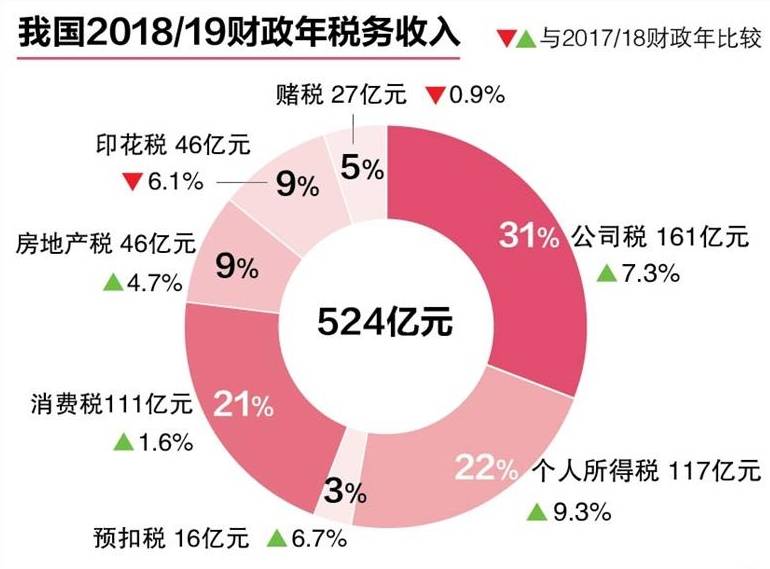 在2018/19年报中指出,所得税占了总税务收入的56%,达294亿元,比上个财政年多了22亿元。所得税包括公司税、个人所得税和预扣税。