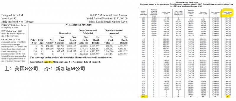 根据非保证收益率演算,美国G公司演算利率是7.54%, 新加坡M公司按5.5%演算, 新加坡更保守一些,但保障杠杆高过美国的.