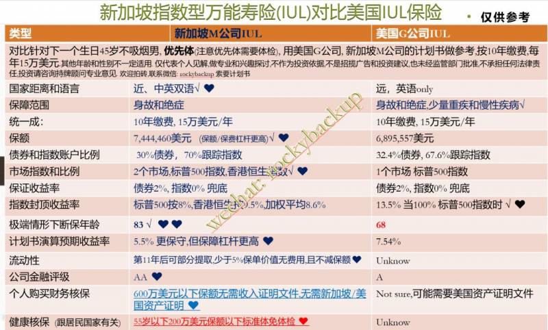请注意G公司的IUL包含了慢性疾病和重疾的保障因素,新加坡的IUL不包含这块,所有不是apple to apple的对比