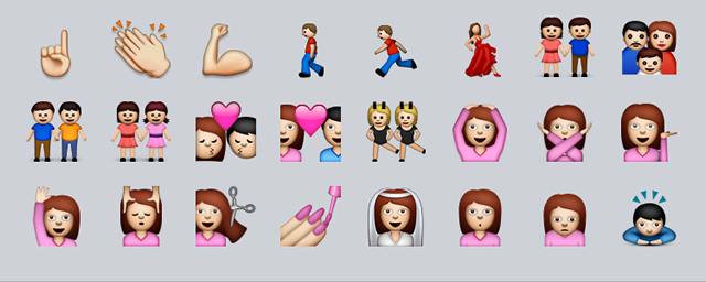 最近推特上许多程序猿都在欢欣鼓舞地讨论一件事:苹果刚刚发布的iOS 8.3测试版,一下子增加了300个新的表情图标,除了可以任意地选择肤色,还多了很多不同性取向人士组成的家庭模式图标。