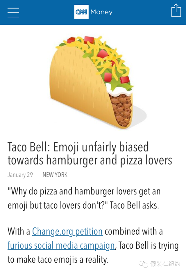 还有一个最不可思议的家伙也加入了战团,那就是美国的墨西哥风味连锁快餐店Taco Bell。他们质问,为什么食物图标里有汉堡、披萨、薯条,却没有我们墨西哥风味的玉米卷?这不是赤裸裸的歧视玉米卷爱好者吗?