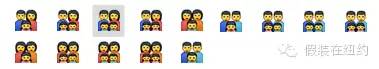 除了肤色,苹果还增加了很多不同性取向人士组成的不同类型的家庭图标。下图是目前使用的家庭图标,可以看到除了上一版本增加的两男组合和两女组合外,带小孩的图标只有“一男一女带一个男孩”一种。