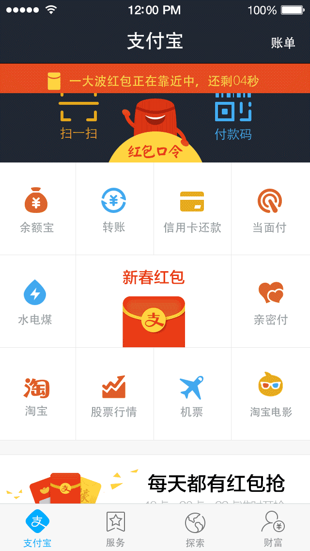 2月11-19日,支付宝钱包(更新到8.5最新版)首页会不停掉红包,据说总共要掉大概6亿元。卧槽,面对这样的炫富行为,我只想说:来吧!我准备好了!