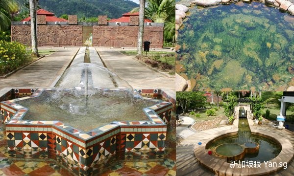 位于兰卡威(浮罗交怡)东北的温泉村,距离瓜镇(Kuah Town)14公里,过去曾命名为Telaga Air Hangat,为世上仅有的四个盐水温泉区之一,其特色之一就是有个三层人造喷水池,底下则是温度不同的三口泉水,分别喷出冷水和热水,旁边有一块18公尺高的手制石壁记载着各种传说。