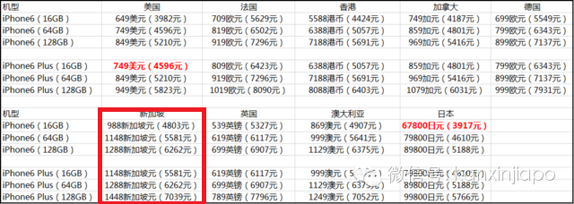 新加坡的iPhone 6裸机售价从988新币起,iPhone 6 Plus裸机售价从1148新币起。苹果官网已经可以查到首发的九个国家或地区裸机iPhone 6、iPhone 6 Plus的售价信息。通过下面这张表可以直观的看出各个国家不同版本iPhone 6、iPhone 6 Plus的价格差异。经过对比,最终看到iPhone 6(16GB)最低价格是日版,折合人民币约为3917元。iPhone 6 Plus(16GB)最低价格是美版,售价约为4596元(但是好像都是税前价,不过对于游客来说,反正可以退税……)。新加坡的裸机价格居中。如果你是本地长居的网友,可以等待电信商的牵线价格,如果你是游客,不管是考虑到价格、充电插头还需要转换、还是保修的方便程度,新加坡都并不是个好选择。