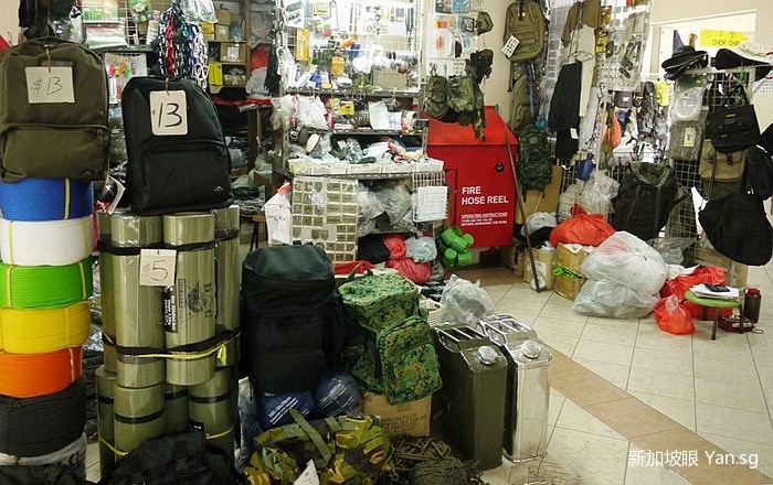 很著名的Amry Market,位于Beach Road上的Golden Mile Food Centre,是一个军品和户外用品主题的廉价小商品批发市场。Army Market里经常还是有不少好东西的,适合慢慢逛慢慢淘再和老板砍砍价。像Vaude、Deuter、Teva这些牌子的包和鞋子在这里应该可以拿到全城的最低价。