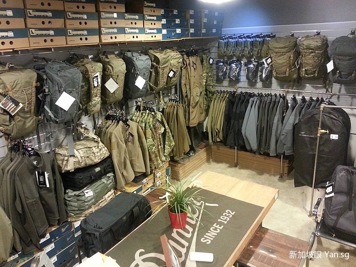 图为该店内售卖的Arc’teryx LEAF顶级军品服饰和背包(美军部队很多都是用的这个),这种背包和衣服的面料的一大特点就是皮实耐用,无论在多么险恶的户外环境中都能扛得住。