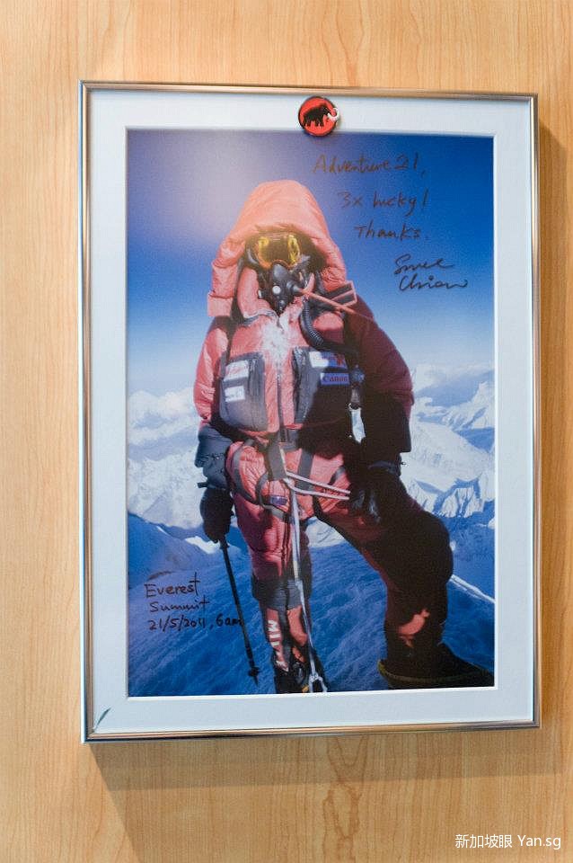 新加坡著名探险家、第一个登上K2乔戈里峰的新加坡人KhooSweeChiow在店内的签名。Adventure 21赞助了一些他所参加的户外探险活动。