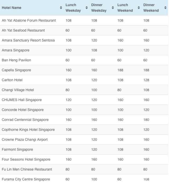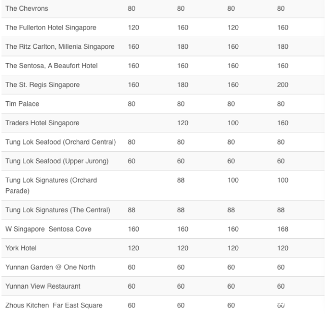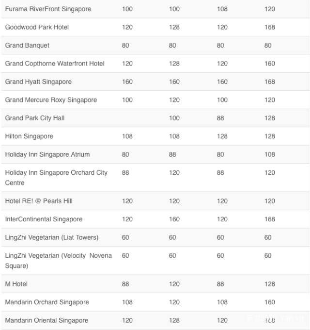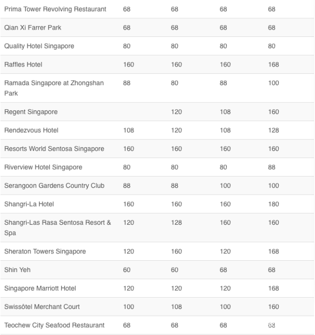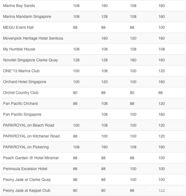 CAPELLA,ST.REGIS等这种超级高大上的酒店一般要给200-250新币/人;金沙,香格里拉等酒店则是160新币-200新币/人;希尔顿,圣淘沙等酒店则是150-200新币/人;凯悦,泛太平洋酒店则是120-150新币。非酒店的餐馆,一般100新币-120新币/人就够啦。如果是自助餐档次的呢,80新币-100新币/人就可以。