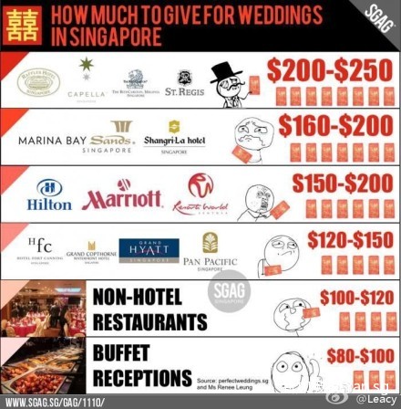 新加坡婚礼红包给多少?原则归纳起来就是根据婚宴场地成本档次而定,约合自己吃饭的成本为宜。或者以百元新币为标准上下浮动。如果你是学生还没收入,送20元主人通常也不介意。眼哥认为,这才是真正的“出份子钱”~因为其实就是相当于你自己出钱和新人朋友一起吃顿饭嘛。