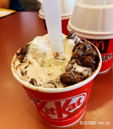说实话,这个Kit Kat麦旋风吃起来没什么特别之处,感觉就是普通巧克力圣代加上一些Kit Kat的巧克力豆,有点甜,感觉还是原来的奥利奥麦旋风更好吃一点~