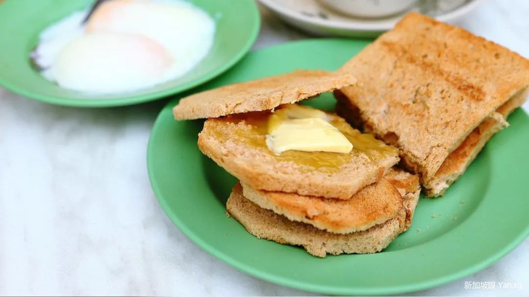 这应该是新加坡当之无愧的国民早餐了。薄吐司烤得香酥可口,包裹着冷黄油碎和由特色斑斓叶制成的咖椰酱,吃进嘴里,面包的酥脆感和咖椰酱的香甜浓郁一起袭来。