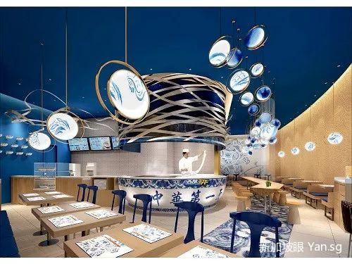 店面整体设计以青花瓷为主题,展现”Chinese Blue Art”(中国蓝色艺术),传统元素与现代设计结合非常创新。