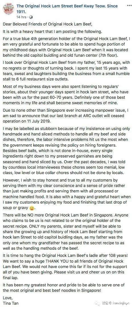 但是,因为新加坡越来越严苛的外劳政策,我不得不宣布,我们在亚历山大零售中心的最后一家分店,将在今年7月11日结束营业。