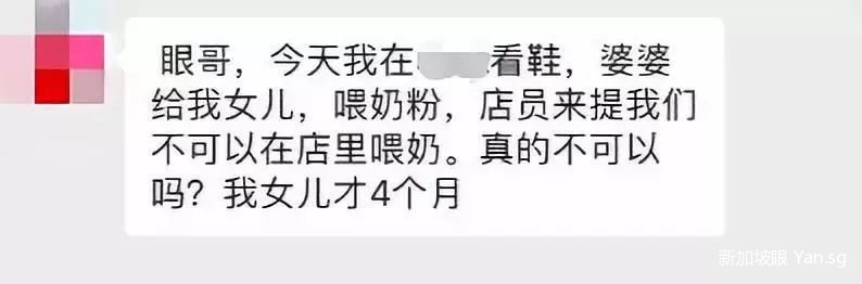 新加坡眼收到网友求助,在商场和家人逛街,婆婆给4个月的女儿喂奶粉,被店员制止了。网友想问,店家这样做,真的可以吗?