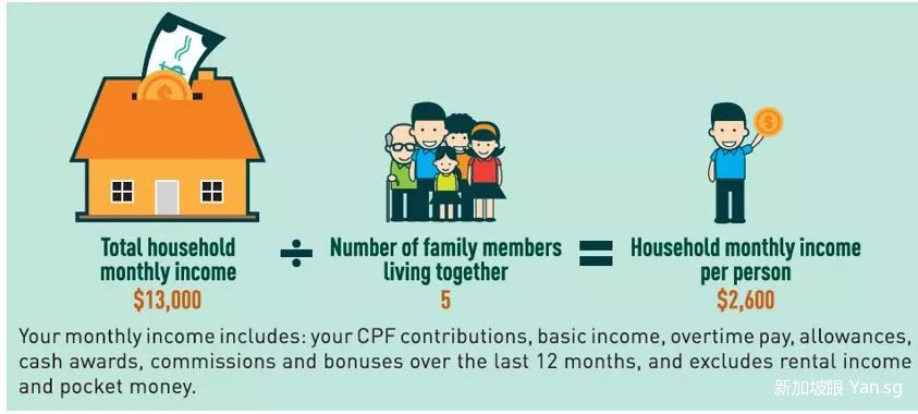 目标人群:家庭人均月收入小于等于1800元新币,无收入家庭则要满足住所年值在21000元新币以下(年值是指房产的租赁估值,是由新加坡国内税务局所评估的)
