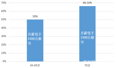 参加工作65-69岁的老人中有一半人的月薪低于1500新币,70岁以上的老人中则有66.1%拿着低于1500新币的工资