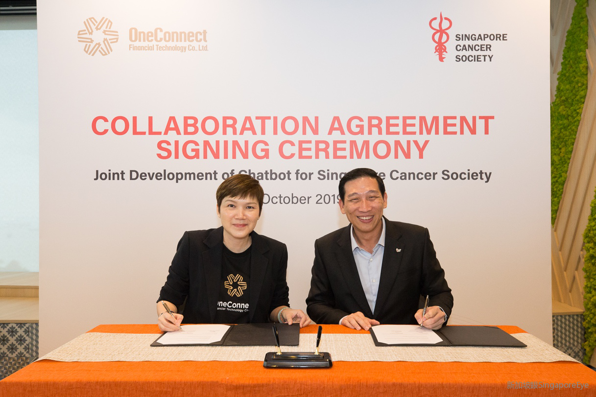 Singapore,25 Octoer 2019 – OneConnect Financial Technology Co. Ltd. (OneConnect), an affiliate company of Ping An Group, today announced at the collaboration agreement signing ceremony, that it is building an artificial intelligence (AI) -enabled chatbot to aid the city state’s leading cancer-fighting charity, Singapore Cancer Society (SCS), to provide greater access to general cancer information and SCS’ programmes and services, so as to improve the quality of life for cancer patients, their families, and the public.