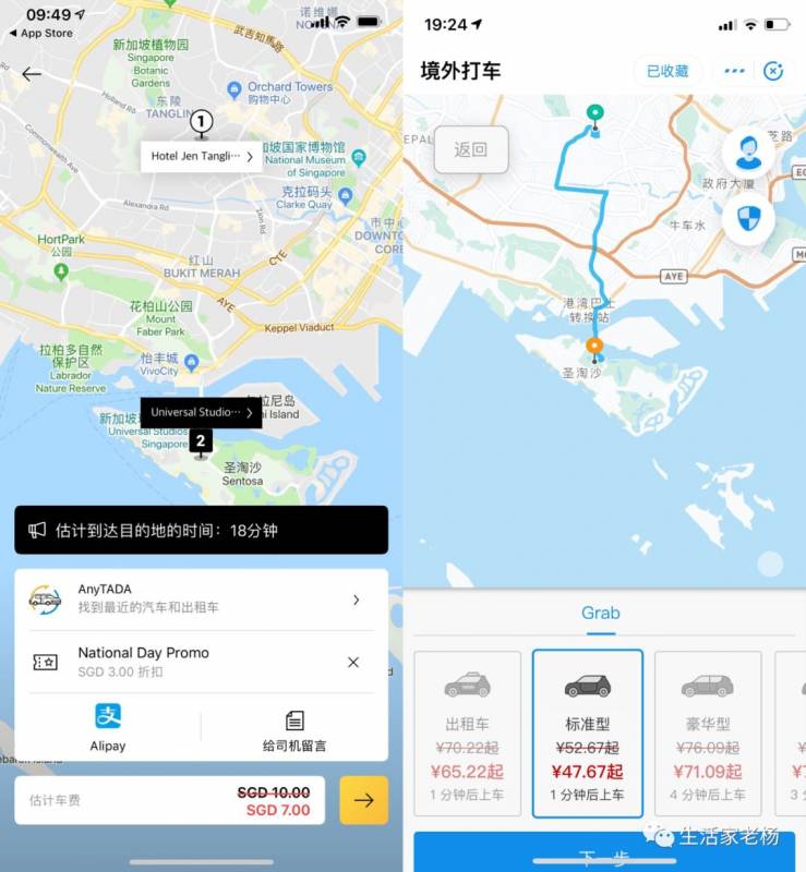 随着grab在东南亚把uber全面吃掉以后,打车首选都是grab了,在新加坡涌现出了很多的打车软件,毕竟grab不是最便宜的,还有很多的市场空间,后去了新加坡以后下载了几个软件(TADA,Gojek,RYDE,Kardi,Urge),便宜是相对便宜了,但是很多时候不好叫车,比如TADA,我用了两次新人优惠,基本上是7新币8公里的样子(这样的价格比国内便宜了),但是没有grab车多,所以如果你时间充裕可以用小众的软件叫车,如果时间紧张的话就直接用grab吧,这里需要重点提一下的是,grab在支付宝的里面有相应的服务,打开支付宝,在搜索框里面输入境外打车,默认的就是grab了,而且汇率还可以接受。需要提醒的是,新加坡法律规定除了计程车公共汽车之外,其他的车对儿童身高135cm以下的必须要安全座椅,如果你用其他软件叫到的是私营车(简单说就是私家车考取了运营执照)而不是计程车,这里就看司机怎么操作了,拒载也是有可能的。