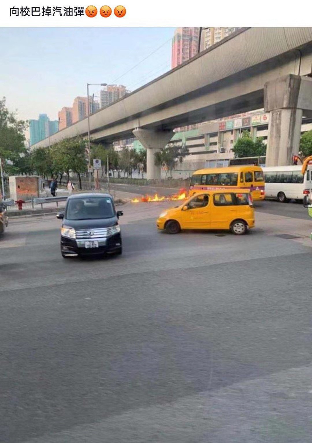 今天早上,有网友上传照片到社交媒体,说一些黑衣人向校车投掷汽油弹: