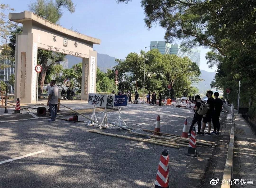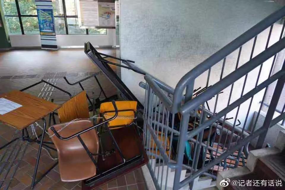 网上流传的图片也显示,香港大学多处被设路障,无法通行。