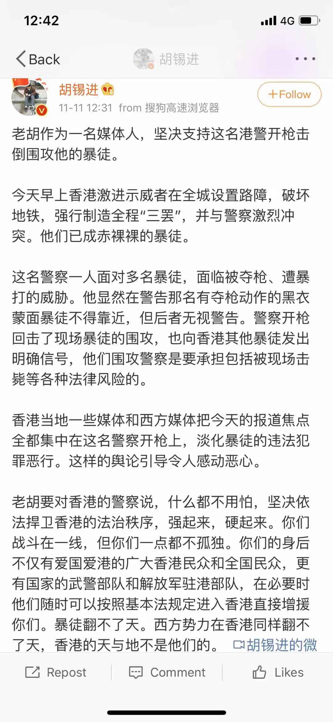 《环球时报》总编辑胡锡进也发长文挺港警: