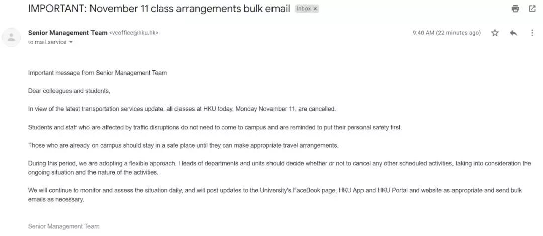而在香港大学发给学生的停课邮件中,校方希望同学们谨慎决定是否出门,以人身安全为重,留意微信和QQ群中的消息。在校内的同学要注意安全,可以在室内自习,尽量避开冲突区域,或选择安全路线离开学校。
