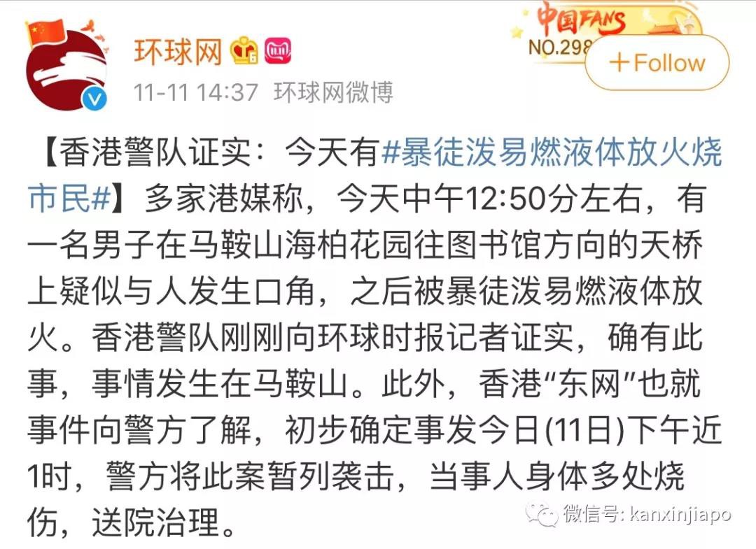 11月11日一早,香港有大批示威者与警察发生大规模冲突,有市民全身被点燃!