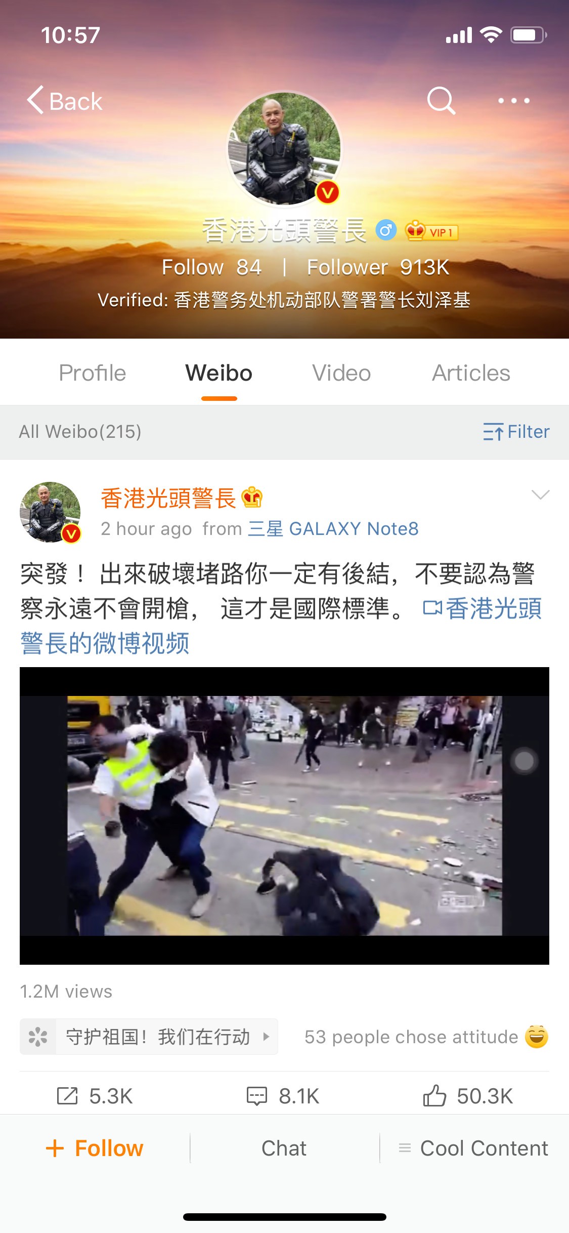 “香港光头警长刘Sir”也在微博发了这一视频,并表示:遇到这样的情况,警察开枪,是国际标准。