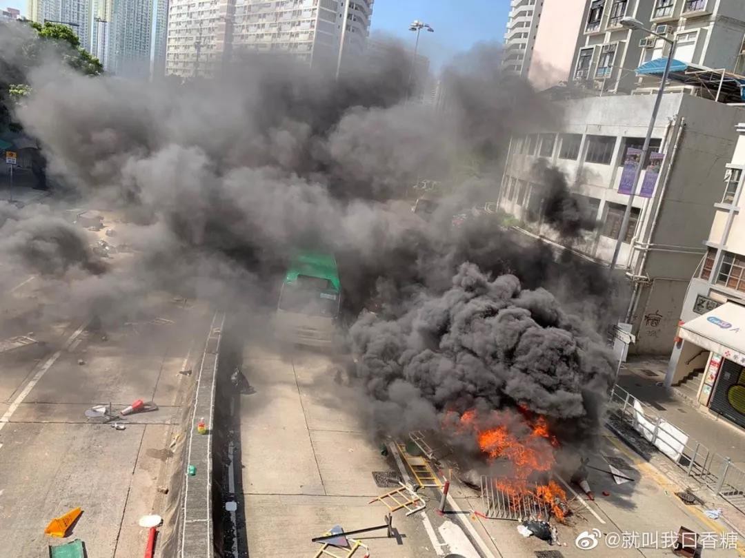 到了中午12点左右,牛池湾一带有示威者把杂物堆砌的路障点燃,现场冒出大量浓烟……