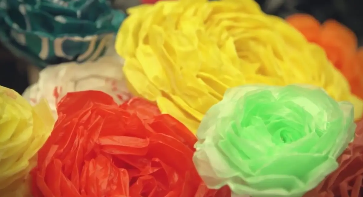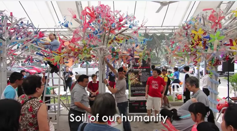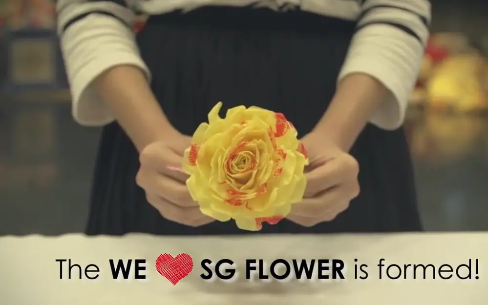 亮点五: 十万朵”我爱新加坡”花散发给参观者,传播美好的祝福。最神奇的是,这些花全是从回收的购物塑料袋做成的。
