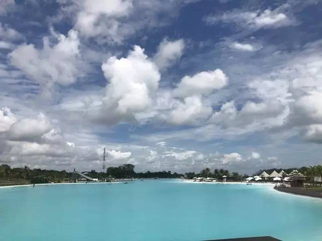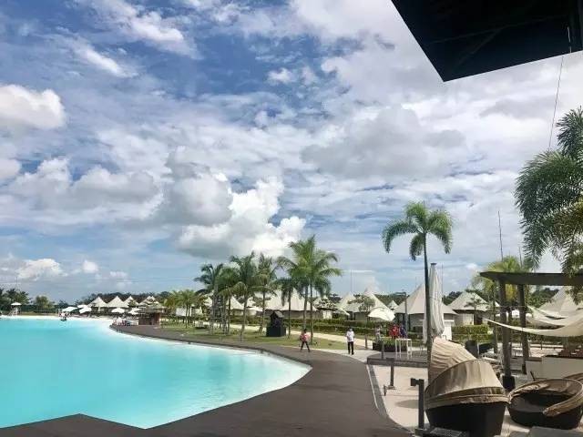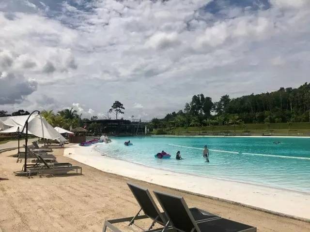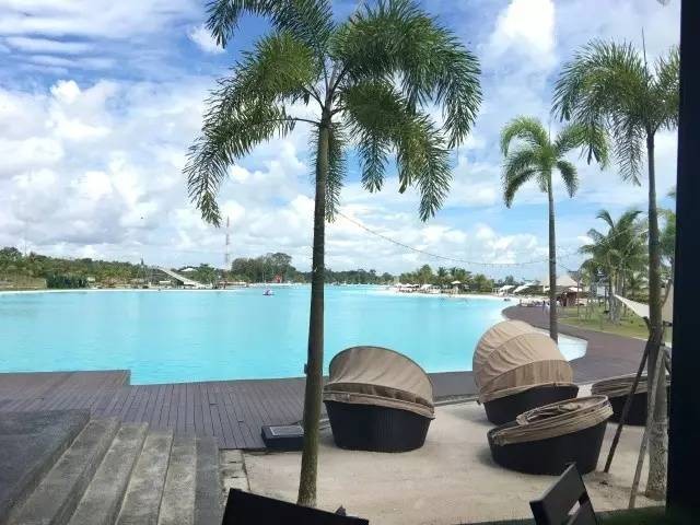 酒店的泳池是最大的亮点,虽然是人工打造的,但因为面积很大,所以给人一种面向大海的错觉,泳池的边缘都是白色的瓷砖所以更显出一副绿水白沙之感,看起来一望无际。